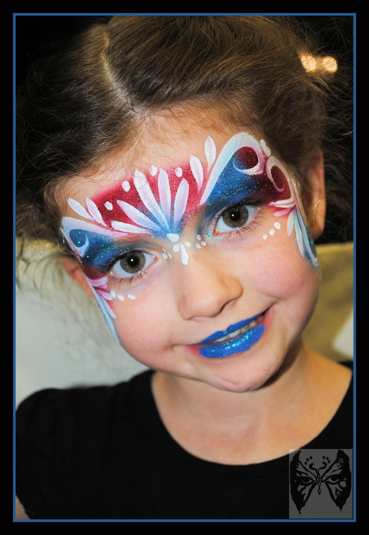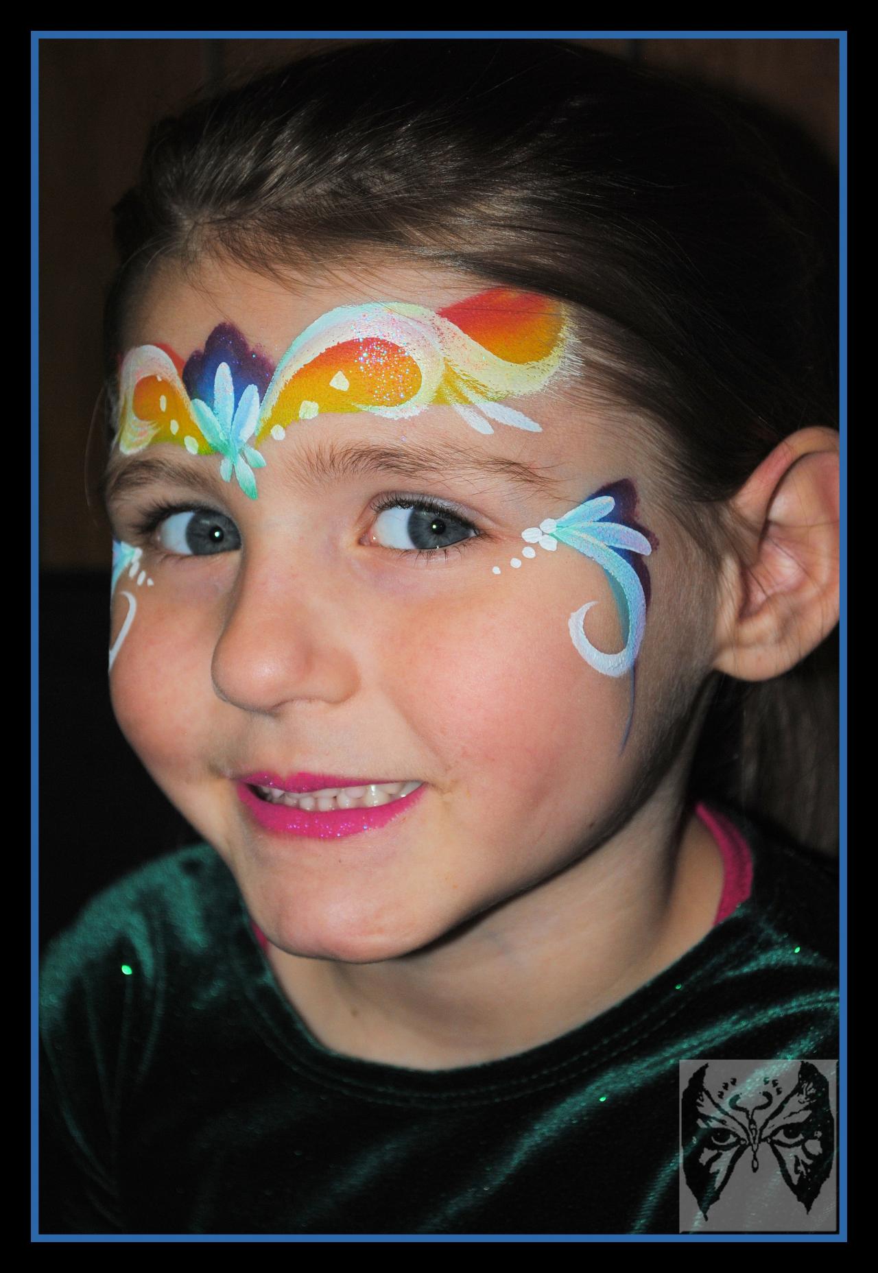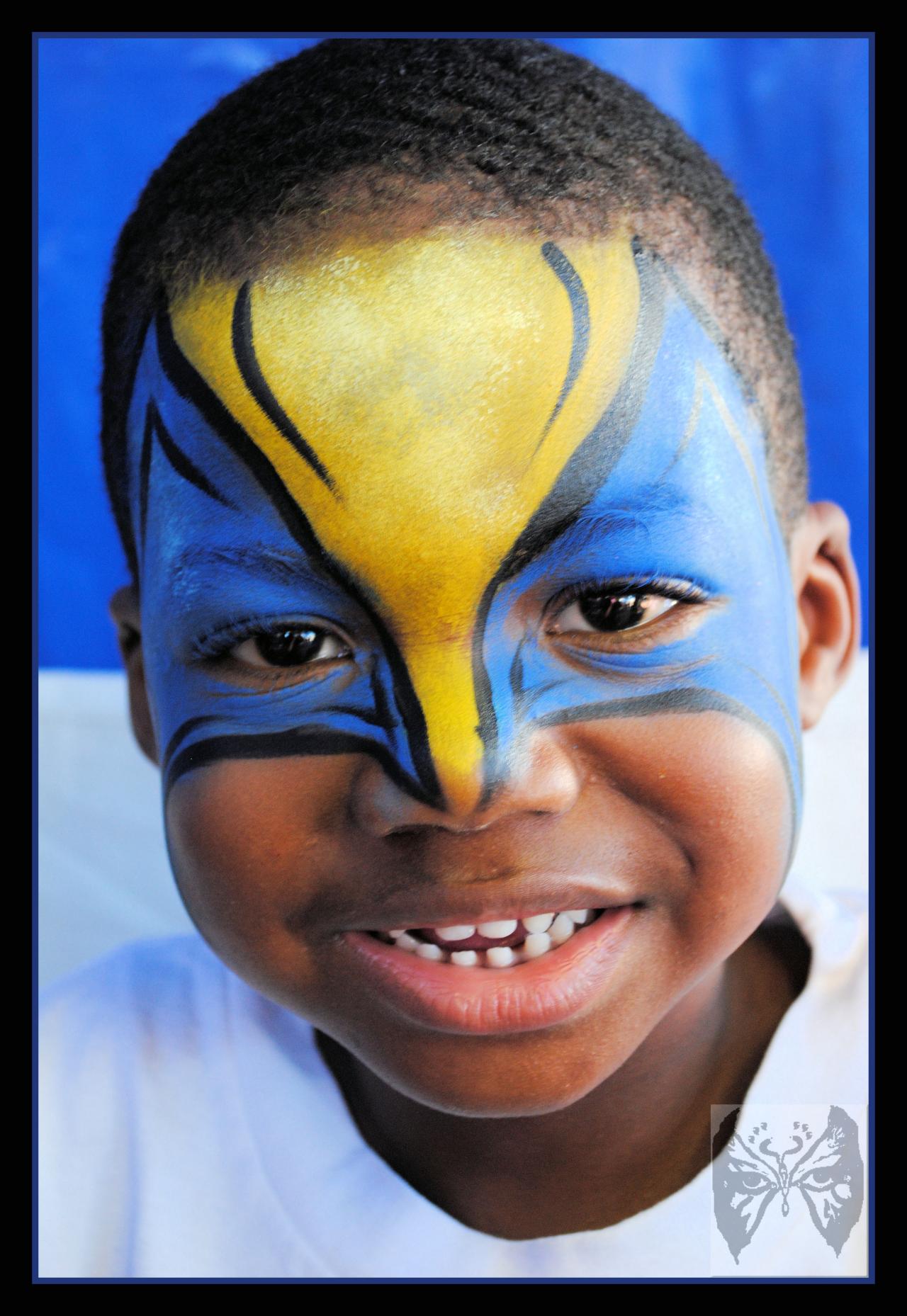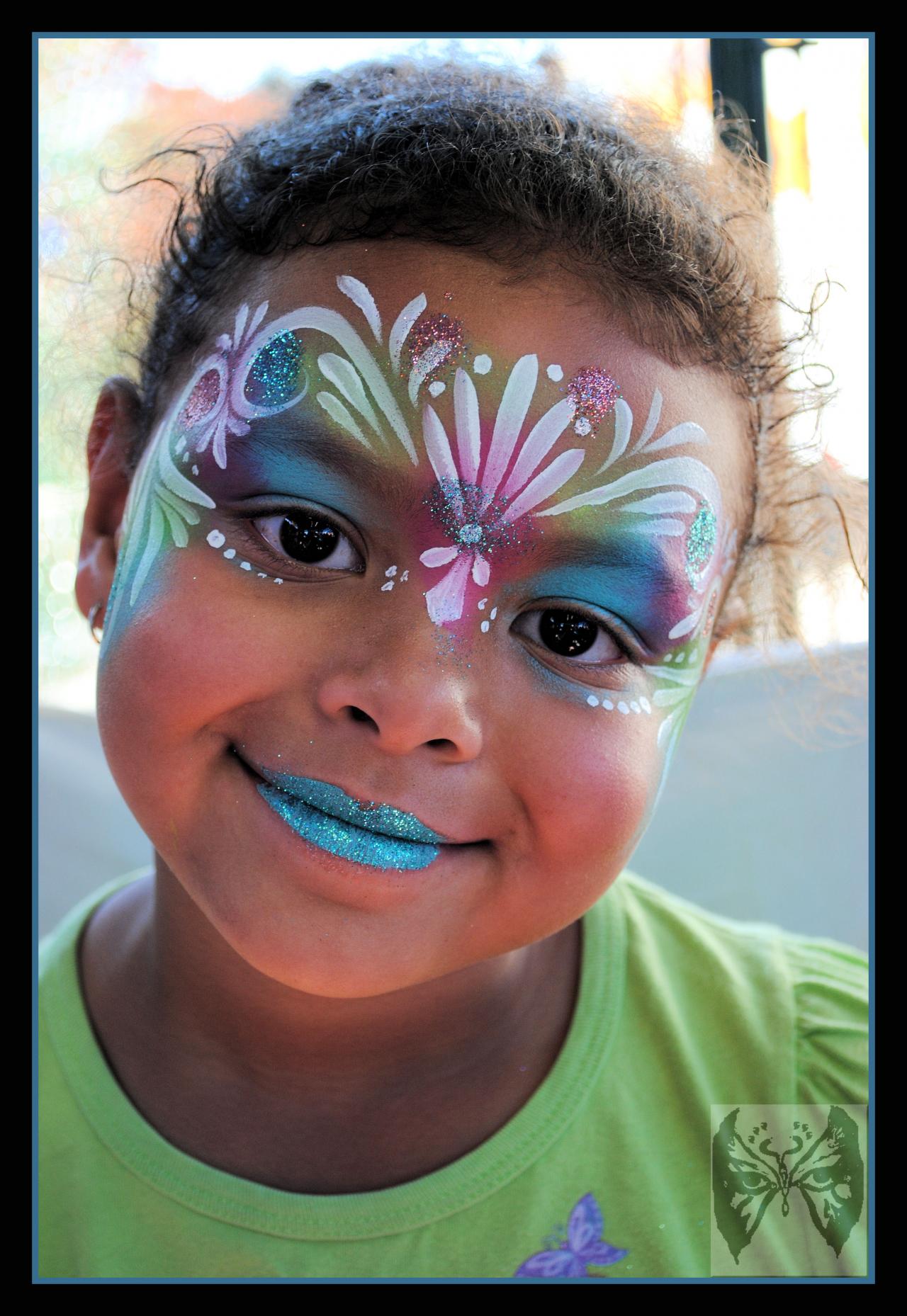 All of our Face Art designs are created using only Professional Face and Body Art Cosmetics, that are made for use on the skin. These water-based colors are hypoallergenic and remove easily with warm water and mild soap on a washcloth. Most designs take us less than 5 minutes to paint (yes, even the full face designs!) and can be customized to match outfits or party themes.